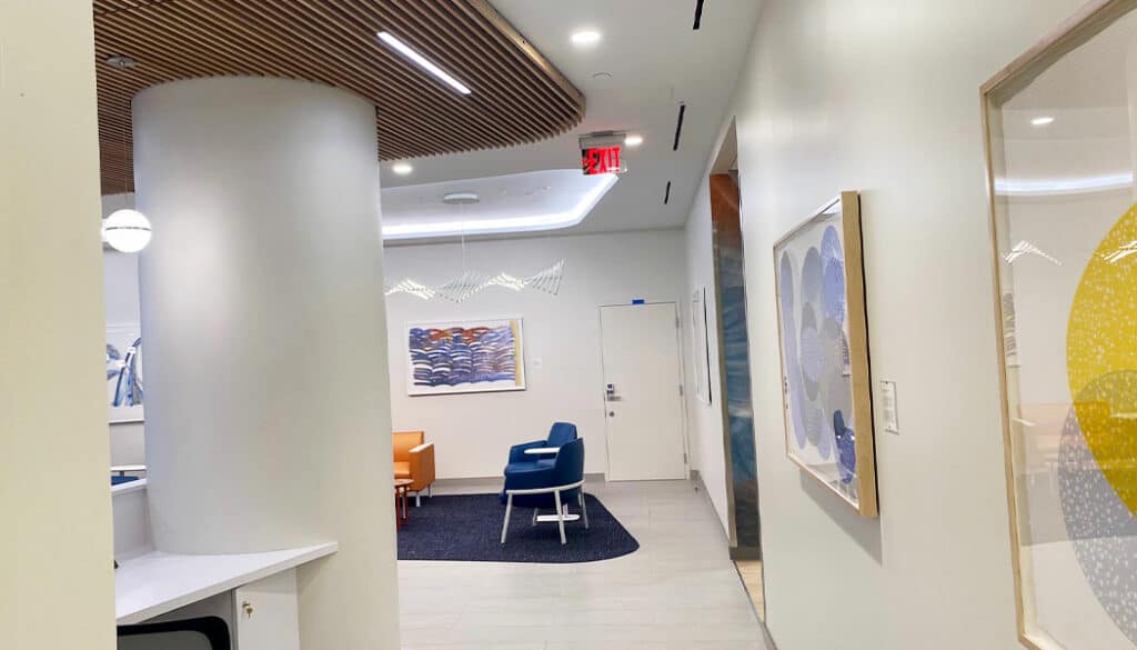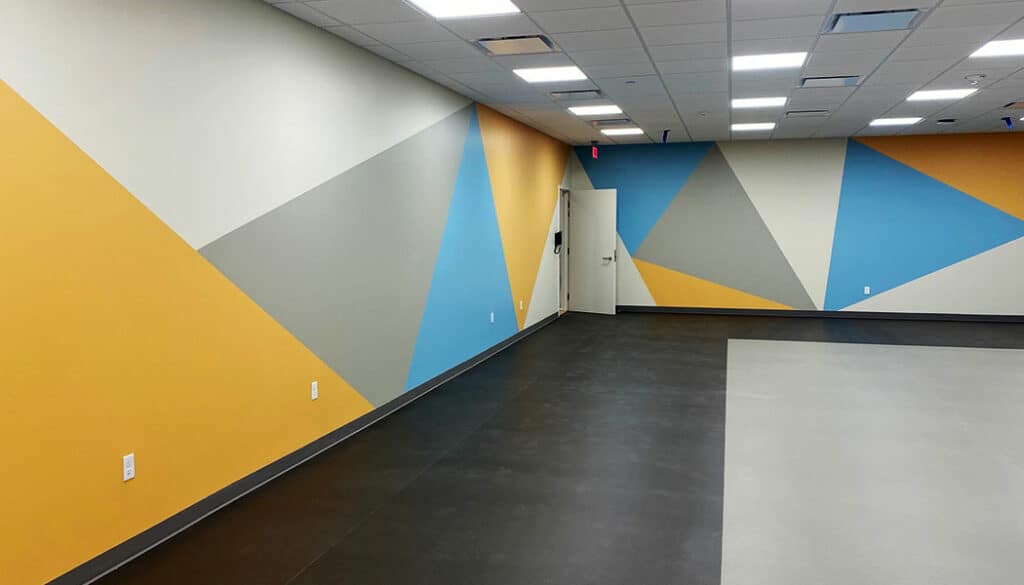 The renovation of an 11,000 SF suite inside their HQ building led to Manders performing both the painting and wall covering scopes. Laser-guided tools were used to create the angles needed to form geometric shapes on several walls. We installed two different wall coverings and also sealed the concrete floors to achieve the final look.