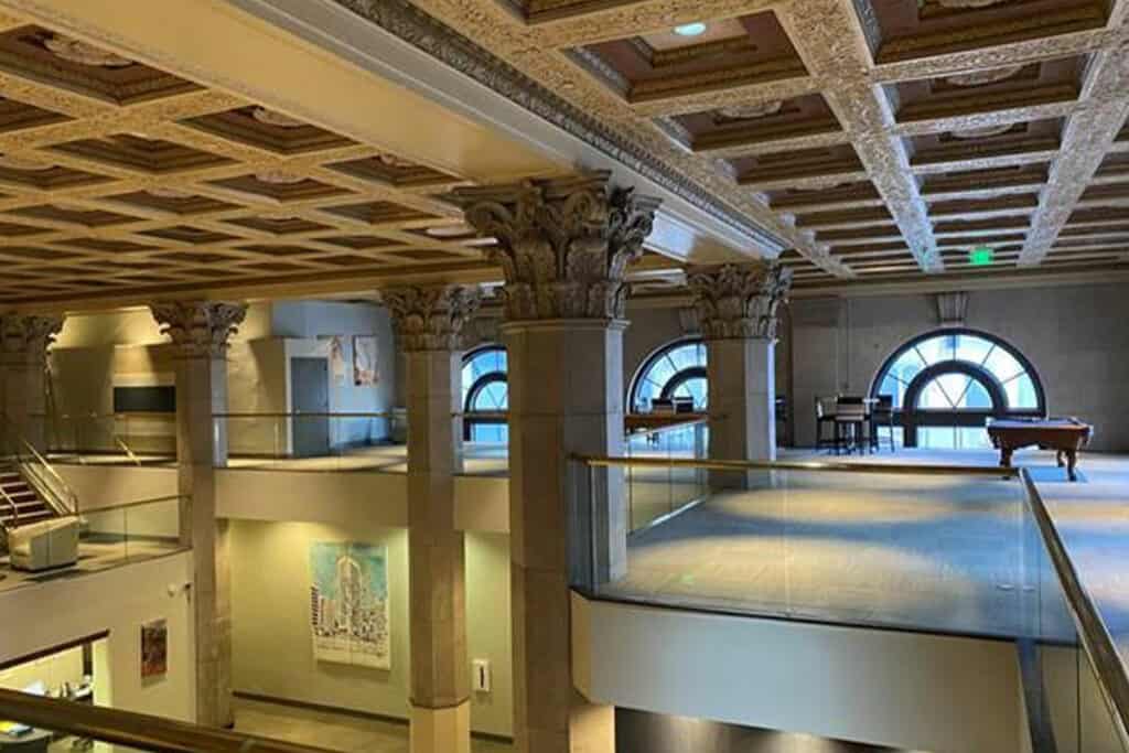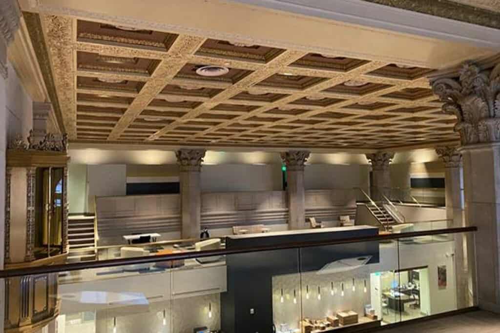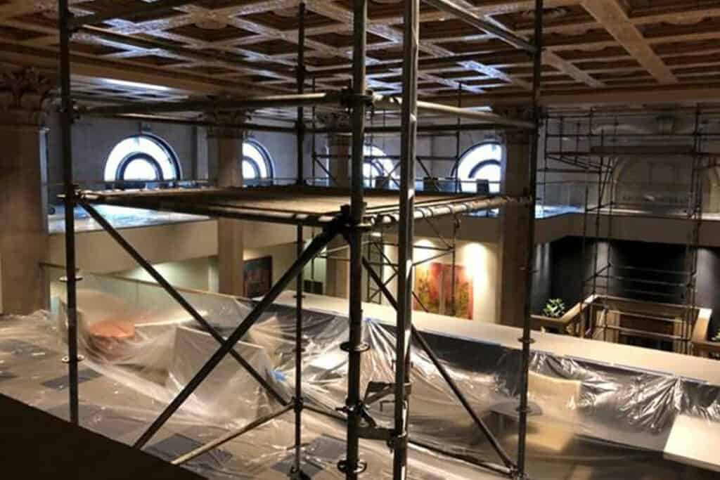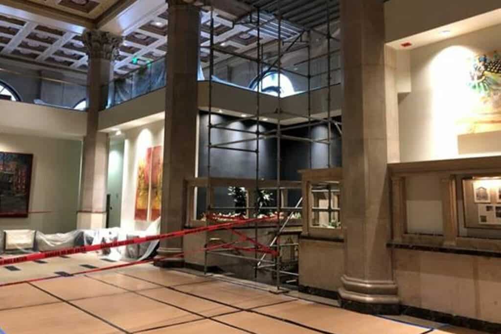 Manders completed the painting and repainting of the ceiling and walls throughout the lobby of the Lenore Apartments in Baltimore, MD. The historic Federal Reserve Bank building features a main lobby with original marble flooring, ornate ceilings, and corinthian columns. Utilizing scaffolding and safe practices, our highly trained and skilled painting technicians performed paint repairs as part of the lobby renovation project.